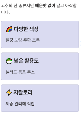 - 빨간 파프리카 : 잘 익은 상태로 단맛이 강하고 항산화 성분이 풍부한 편입니다.