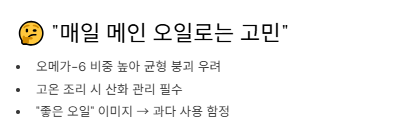 - 오메가-6 비중이 높아 식단이 외식/가공식품 중심이면 균형이 더 깨질 수 있음
