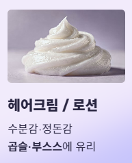 - 헤어크림/로션 : 수분감과 정돈감이 좋고, 곱슬·부스스에 유리