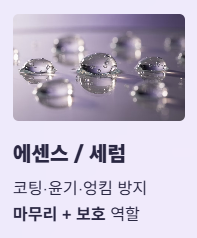 - 에센스(세럼/오일/크림형 포함) : 손상된 느낌을 줄이고, 정전기·부스스함·엉킴을 완화하는 “마무리+보호” 역할