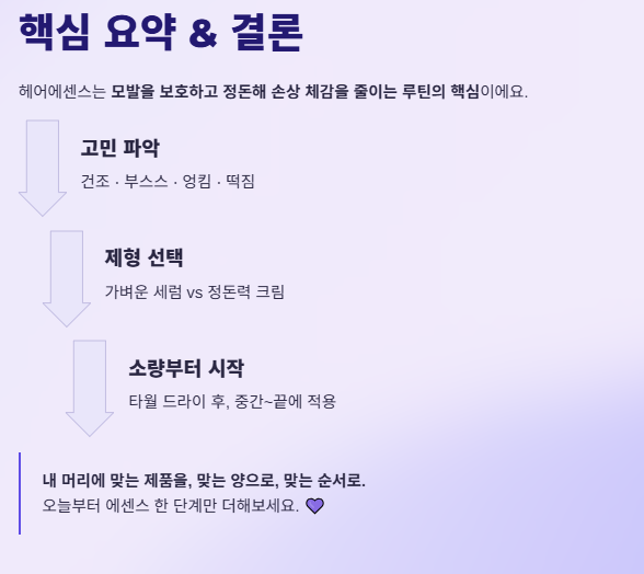 헤어에센스는 단순한 윤기템이 아니라 모발을 보호하고 정돈해 손상 체감을 줄이는 루틴의 핵심입니다.