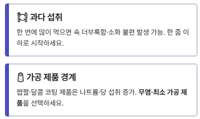 일반적으로 한 번에 너무 많이 먹기보다 간식으로 소량 먹는 방식이 부담이 적습니다.