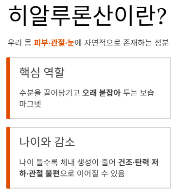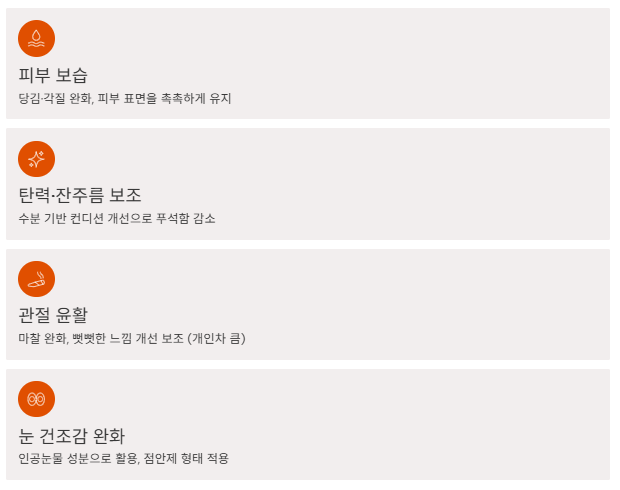 나이가 들수록 체내 생성이 줄어들 수 있어 피부 건조, 탄력 저하, 관절 불편감과 함께 관심이 커지는 편이에요.