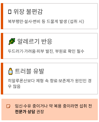 다만 효능은 목적과 사용법에 따라 달라지고, 드물게 위장 불편·알레르기·제품 성분에 따른 트러블이 생길 수 있어요.